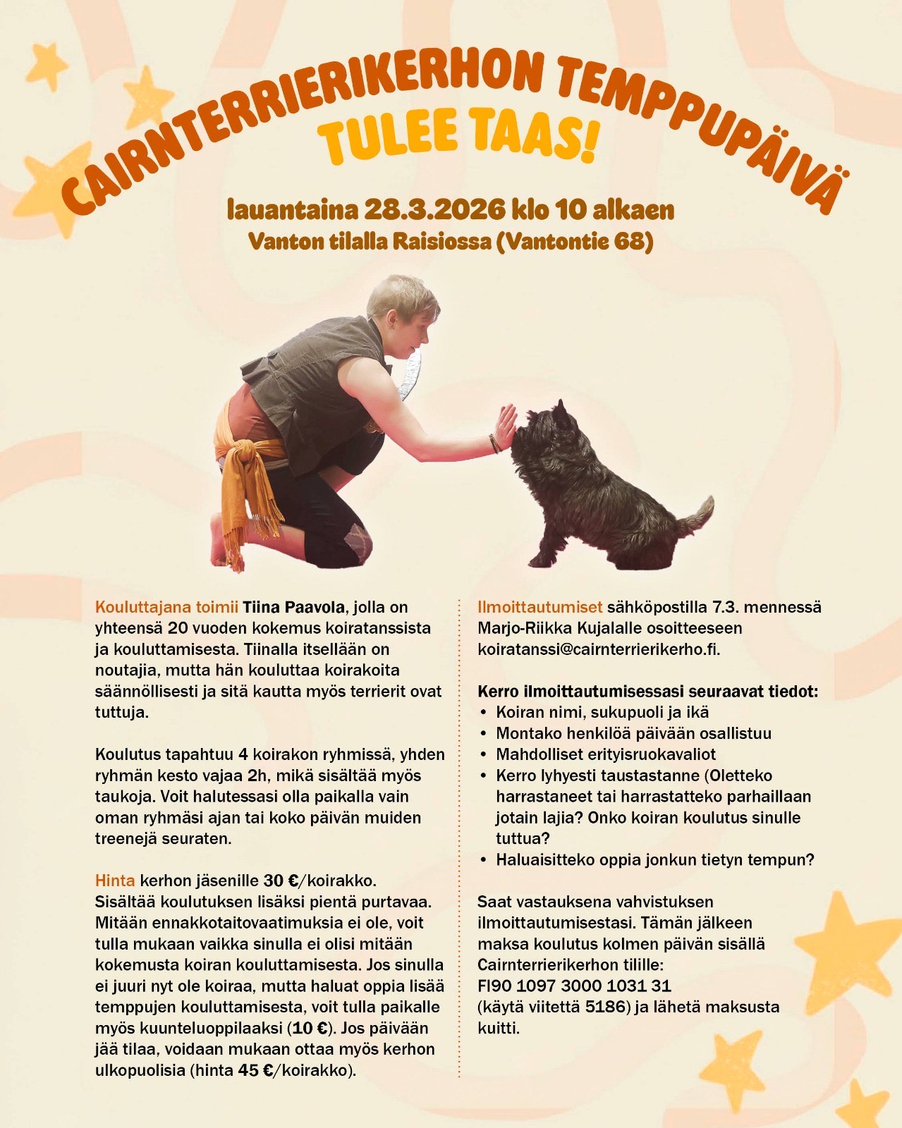 Temppupäivä järjestetään Vanton tilalla Raisiossa 28.3.2026 klo 10 alkaen. Ilmoittautuminen päättyy 7.3.2026.Tervetuloa mukaan pitämään hauskaa!